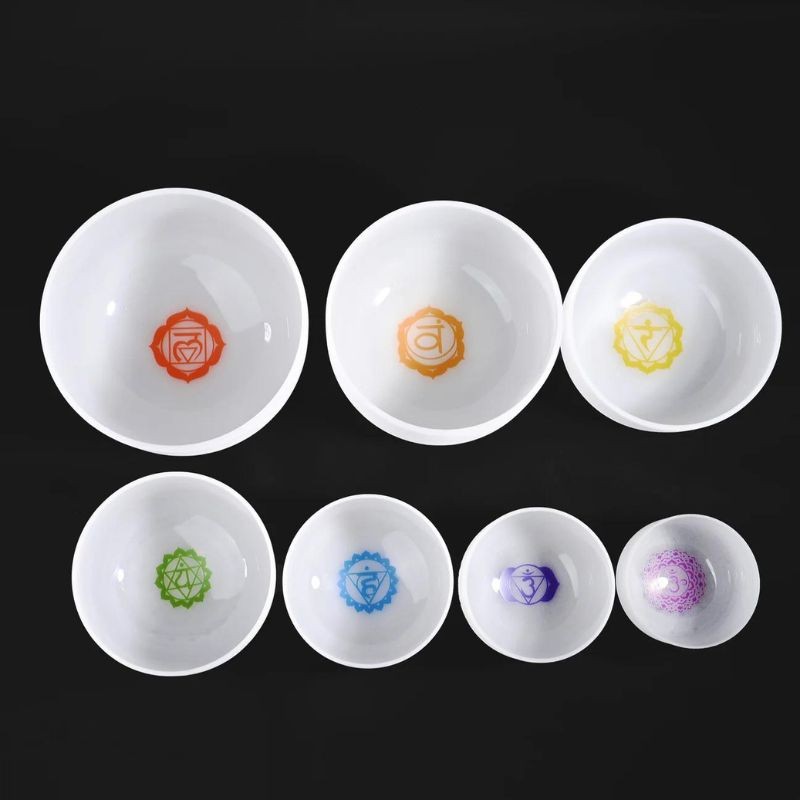 A Frosted Quartz Crystal Singing Bowl Set is a collection of bowls, each tuned to a specific chakra's frequency. These bowls are made from pure quartz crystal and have a frosted appearance due to a specialized manufacturing process.